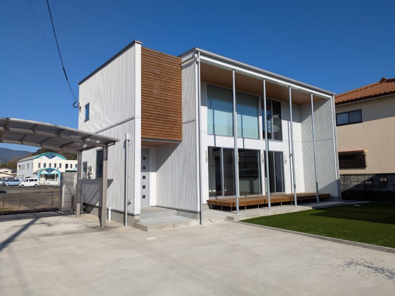 前面ガラス張りの明るく開放的な物件で、広いウッドデッキがあるので子供さんが遊ぶスペースも確保できます。台所は生活感を隠せるように背面全面収納になっています。2階廊下にも大容量の収納がございます♪